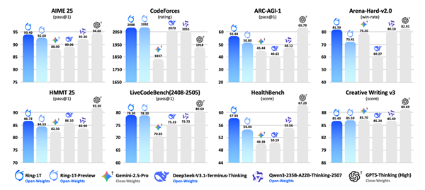 Ring-1T在9月30日开源的预览版Ring-1T-preview基础上,持续扩展大规模可验证奖励强化学习(RLVR)训练,进一步激发万亿基座的自然语言推理能力,并通过 RLHF 训练完善模型通用能力,在各项任务榜单上表现更加均衡。